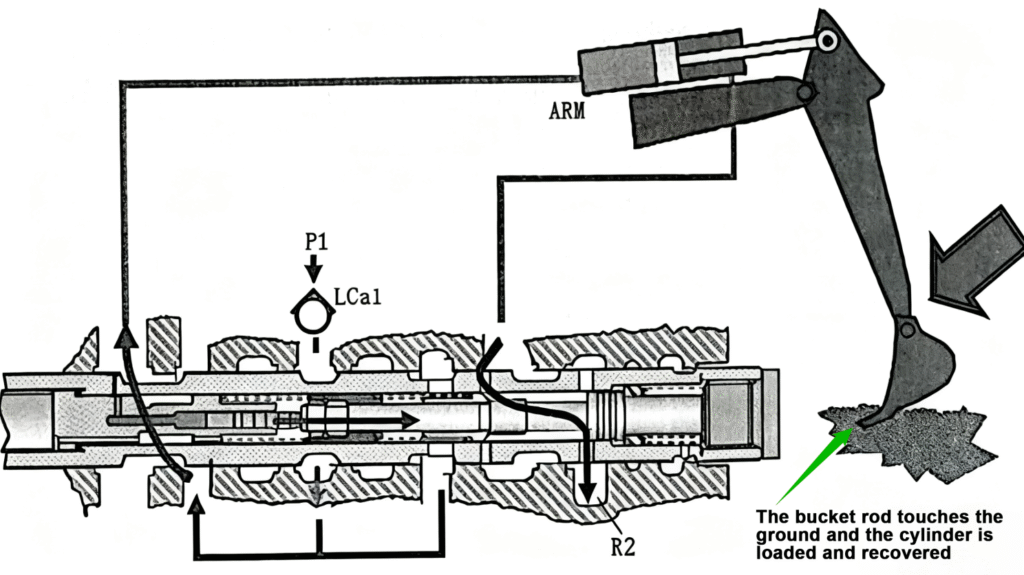 When the bucket contacts the ground, the AR valve switches the system to normal flow, preventing shock and maintaining safety.