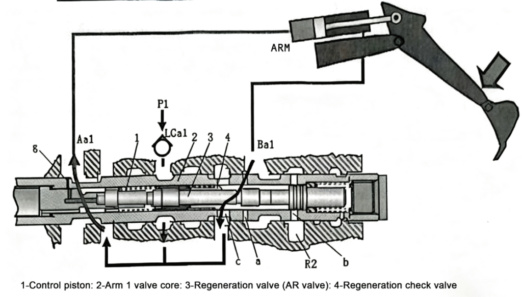 Regenerative Check Valve: Directs return oil from the rod chamber to the rodless chamber during boom retraction.